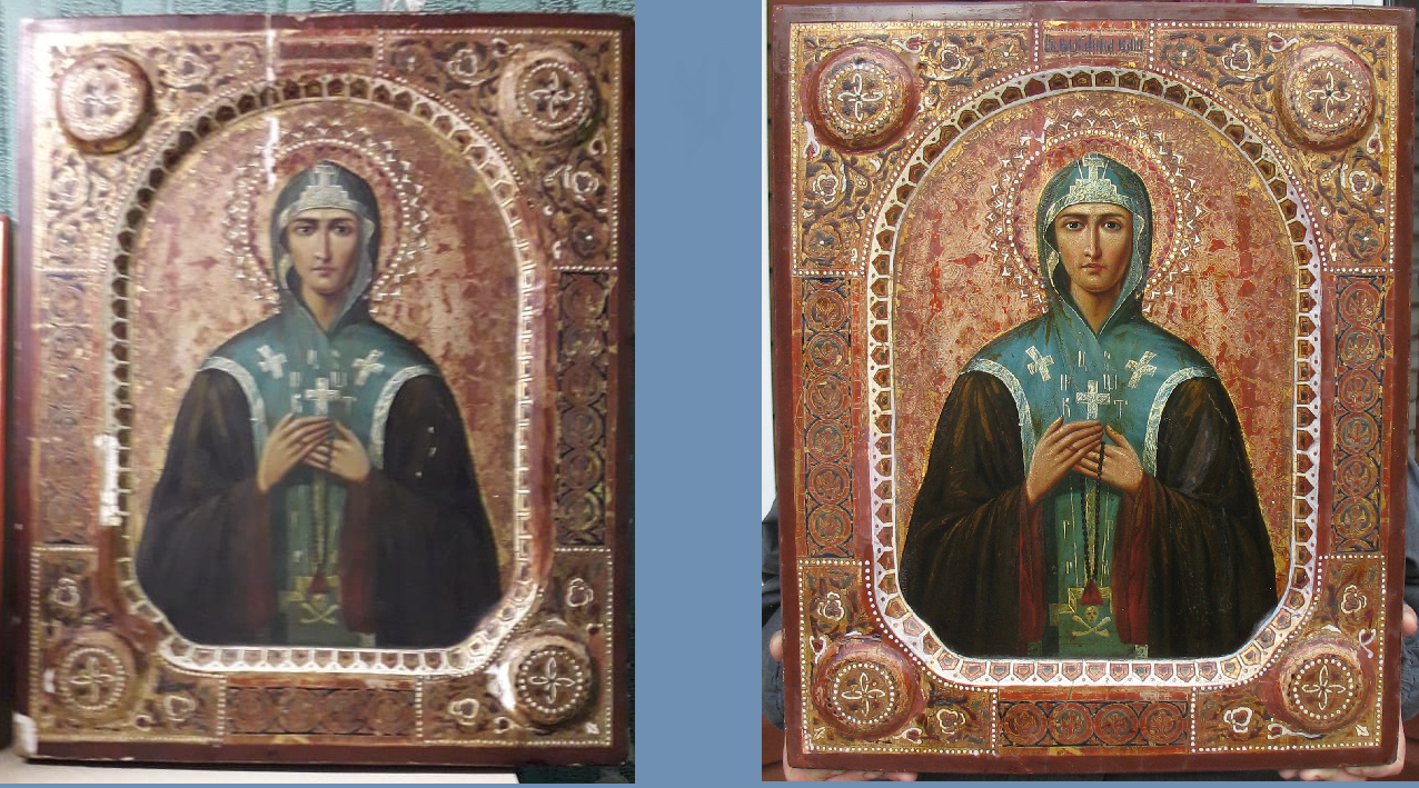 Есть два вида реставрации: музейная и восстановительная. При музейной реставрации икона консервируется, т.е. задача состоит в том, чтобы сохранить икону как памятник искусства в том виде в котором она пребывает сейчас. Восстановительная реставрация - это возвращение иконе ее первозданного вида. Такая реставрация включает работы со всеми слоями иконы (восстановление левкаса, поновление красок и позолоты, покрытие образа защитным слоем).